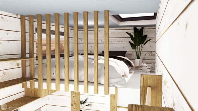 Na antresoli znajduje się miejsce do spania, gdzie można dostać się za pomocą drabinki. Przy przyczepie na dyszlu podwozia jest przewidziana skrzynia z przeznaczeniem jako moduł techniczny lub składzik (w zależności od potrzeb właściciela).