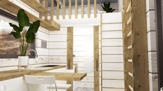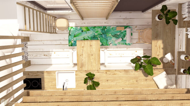 Przestrzeń zajmuje głównie część dzienna połączona z aneksem kuchennym oraz łazienka. Dodatkowo znajduje się tu miejsce pracy: blat biurkowy z krzesłem/taboretem, szafy/szafki/półki do przechowywania, blat wysuwany w celu zjedzenia posiłku, 2 taborety/krzesła oraz wyposażenie kuchenne (kuchenka, okap, zlewozmywak, blaty robocze, szafki, półki). Łazienka jest wyposażona w prysznic, toaletę kompostową, szafki, półki oraz umywalkę.